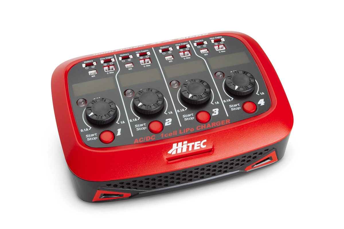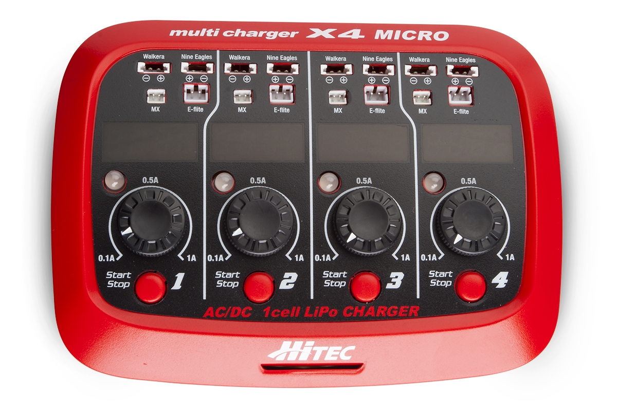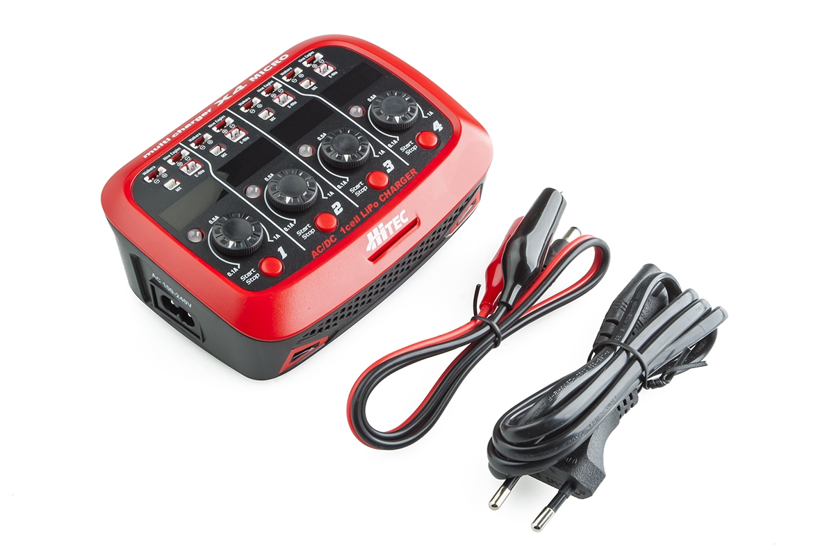 Inteligentní čtyřkanálový nabíječ Hitec MultiCharger X4 Micro s výkonem 4x 4 W jednou provždy vyřeší vaše problémy s nabíjením jednočlánkových LiPo akumulátorů pro pokojové vrtulníky, multikoptéry a miniaturní modely letadel. Na nabíječi můžete nabíjet hned 4 1S akumulátory najednou, každý kanál je opatřen výstupními zásuvkami pro čtyři různé systémy konektorů (Blade MX, mCPX, Micro, Micro-R), takže pokrývá valnou většinu běžných akumulátorů používaných v mikromodelech.