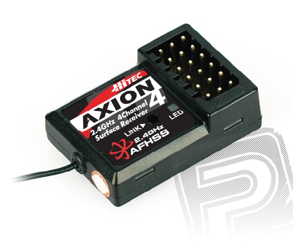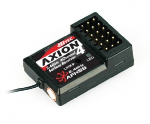Přijímač AXION 4 2.4GHz je vybaven kontaktovými lištami pro standardní konektory UNI (=JR/Graupner, Hitec, Futaba) umístěnými na horní straně krabičky. Kromě kanálových výstupů je k dispozici zásuvka pro napájení a zásuvka pro připojení personálního čipu AMB.