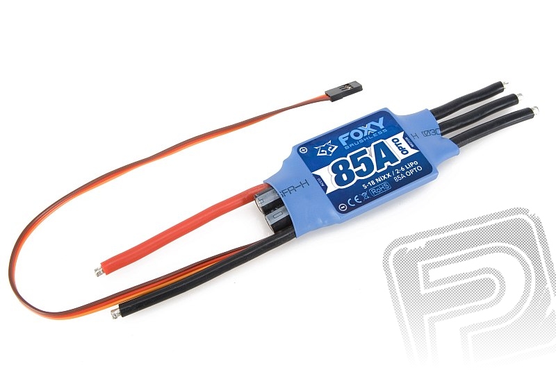 Programovatelný střídavý regulátor pro modely letadel a vrtulníků. Trvalý proud 85A(špičkový 100A), napájení 5-18NC/2-6 LiPO článků, hmotnost 60g, rozměry 34x46x12mm.