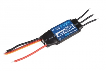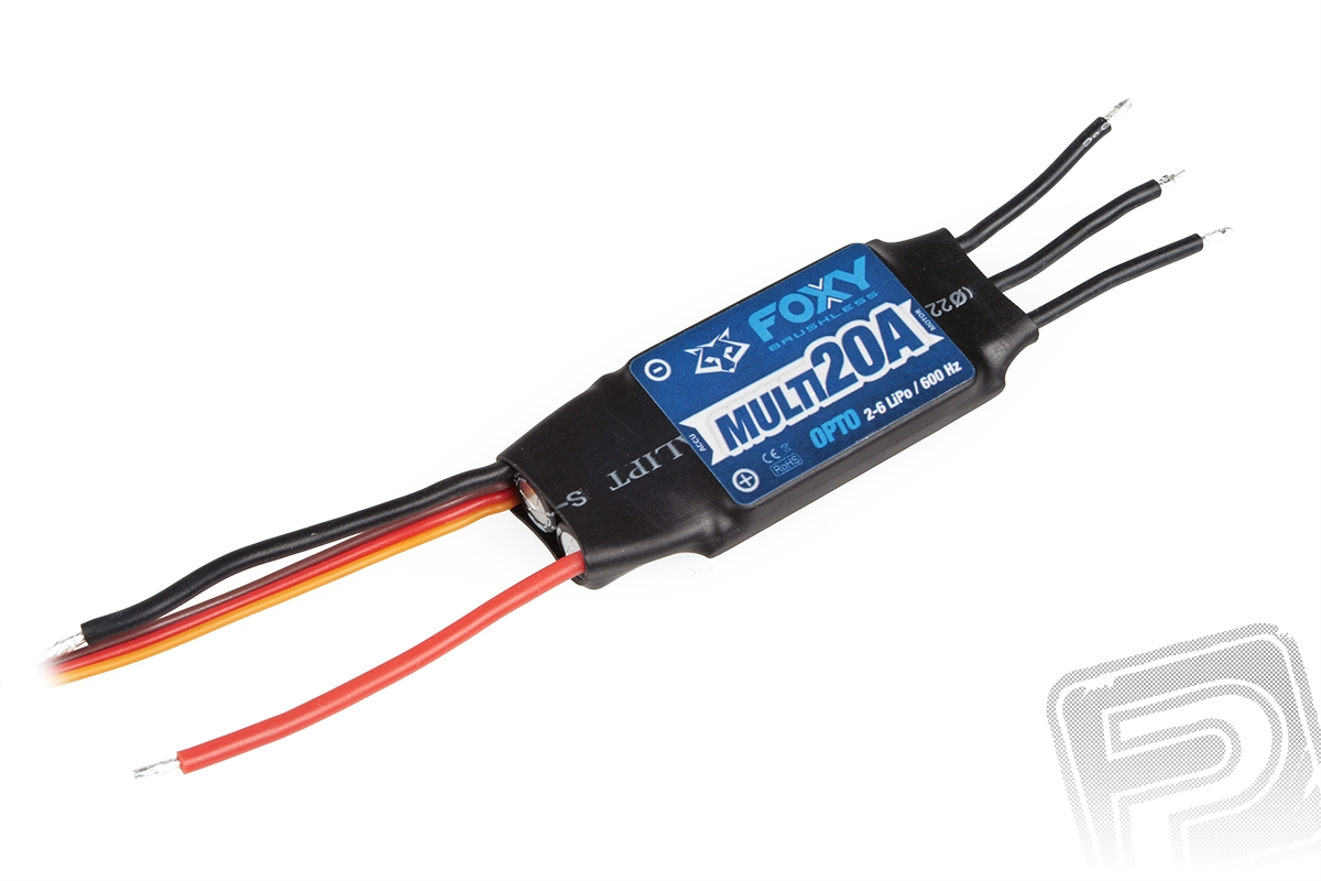 Špičkový regulátor řady FOXY MULTI 20A je určen pro použití v hobby modelech multikoptér velikosti „300“ až „330“. Pokročilé řídící obvody a firmware SimonK podporují i nejpokročilejší řídící jednotky používající opakovací frekvenci signálových impulsů 400-600 Hz pro zajištění extrémně plynulé a bleskurychlé odezvy. Regulátor FOXY MULTI 20A není vybaven stabilizátorem napájení BEC, pracuje s napájením z 2-6S LiPo akumulátorů. Pro uvedení do provozu není třeba žádné programování ani nastavování.