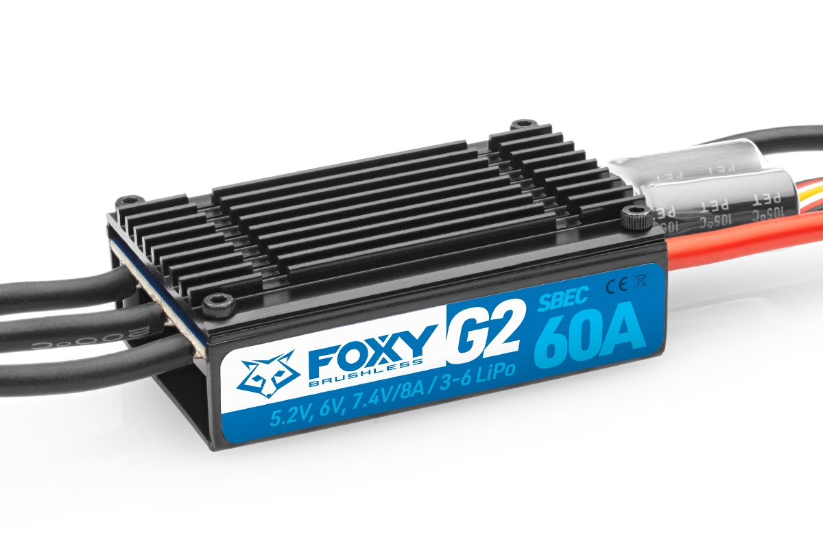Nová generace programovatelných mikroprocesorových regulátorů pro střídavé motory bez senzorů („brushless, sensorless“) pro rekreační a sportovní modely letadel s napájením z akumulátorů LiPo/Li-ion/LiFe. Oproti předchozí generaci regulátorů FOXY byly rozšířeny možnosti programování o řadu nových funkcí a regulátory G2 využívají pokročilou technologii optimalizovaného řízení významně zlepšující odezvu plynu a účinnost řízení výkonového stupně. Konstrukce regulátoru klade zřetel na vysokou dlouhodobou zatížitelnost a odolnost, jaká je vyžadována ve velkých modelech s větším počtem serv. Regulátory jsou vybaveny výkonným spínaným stabilizátorem napájení BEC s volitelným výstupním napětím zajišťujícím napájení přijímače a serv (normálních i HV) z pohonného akumulátoru. Pro snadné nastavování regulátoru slouží speciální LED programovací karta FOXY G2, která je dodávána zvlášť.