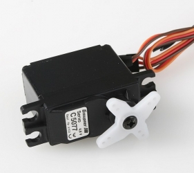 Servo 37g s plastovými převody. Tah 5,0 kg/cm, rychlost 0,125s/40st při 4,8 V, provozní napětí 4,8-6 V, rozměry 38x19x37mm.