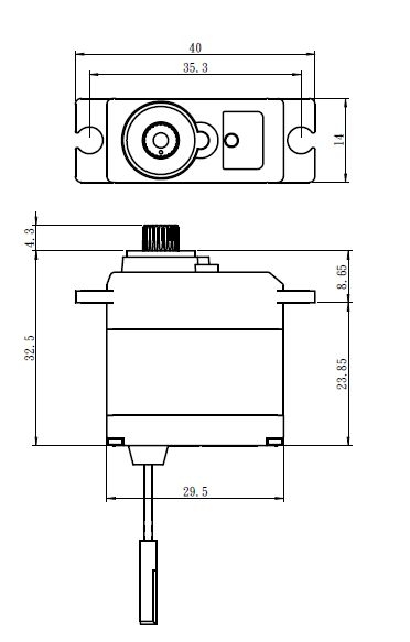 Digitální WATERPROOF micro servo s stejnosměrným motorem a kovovými převody, 1x kuličkové ložisko, 3,5/5.0kg při 4,8/6,0V a 0,14/0,11s na 4,8/6,0V, váha 25,0g, 29,5x14,0x32,5mm. Provozní napětí 4,8 - 6,0V.
